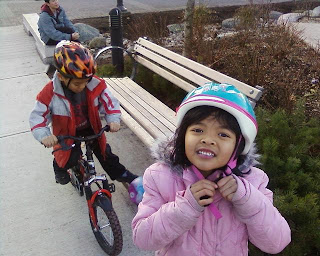Teo is having a birthday party today, at the Gym, a favourite for kids’ birthday parties in the UBC area. Teo is another one of Arman's classmates from Kinderclub. He lives just 4 doors up the block (we're on the same block, literally).Anyway, the day's festivities began with our customary trip to Kumon. We had to hurry, so I decided to let the kids ride their bikes to the bus stop. Walking there usually takes about 15-20 minutes, so riding their bikes was a big time saver. Here they are cheerfully waiting for the bus, with their bike helmets still on. After Kumon, it was onward to the Gym. Melur tagged along even though it was only Arman who was invited. There were some vacancies at the party, so Teo's mom let Melur join in the festivities. Say thank you, Melur. And she did. The first portion of parties at the Gym is of course the gymnastics part. I took some pictures and videos of the event. They played some hide and seek: And they also played with this huge parachute that they made into a bubble, while they sat inside (that's what this is): |
